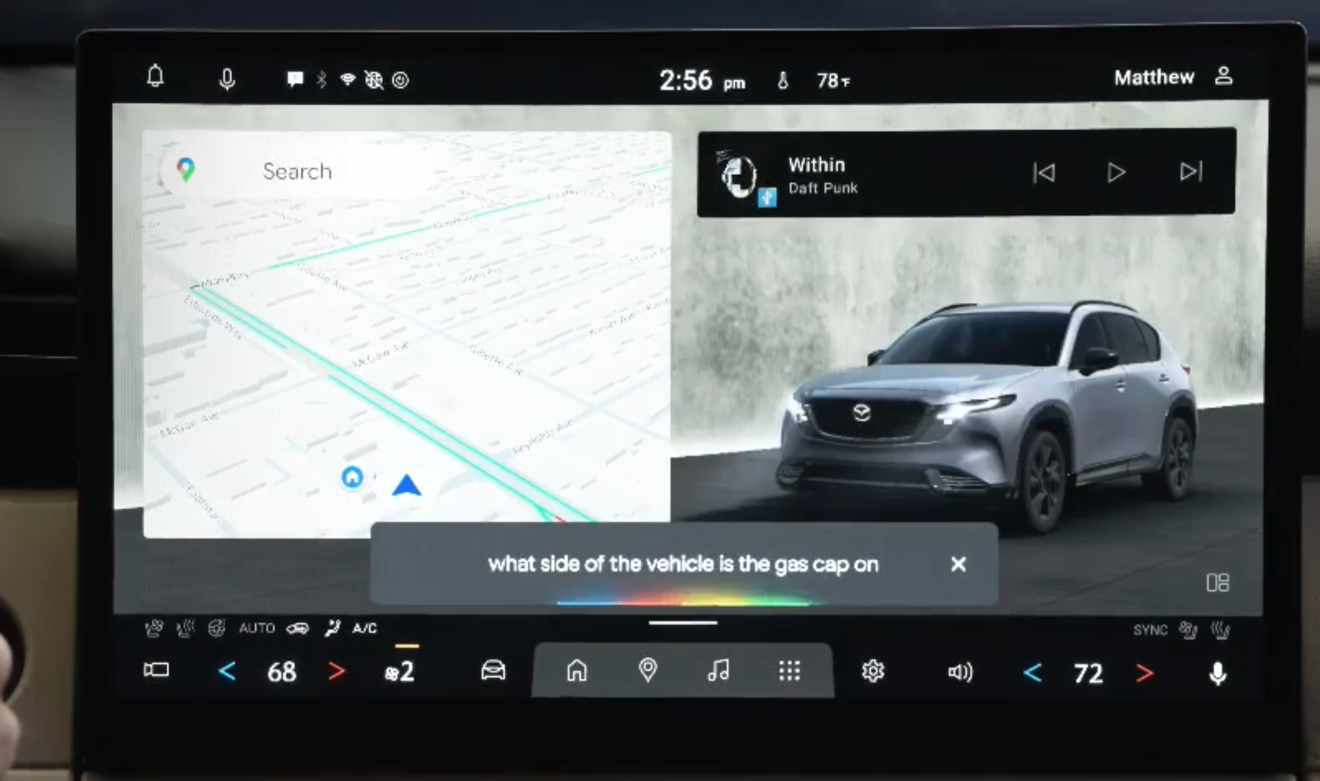 - The system uses Google Gemini AI technology to significantly improve voice command capabilities. For example, instead of providing a specific address or business name, you can ask, "Give me the name of a four-star seafood restaurant on FM 1960." If you like the suggestion, you can simply say "Direct me there," and it will automatically enter the location into Google Maps and show you the way.